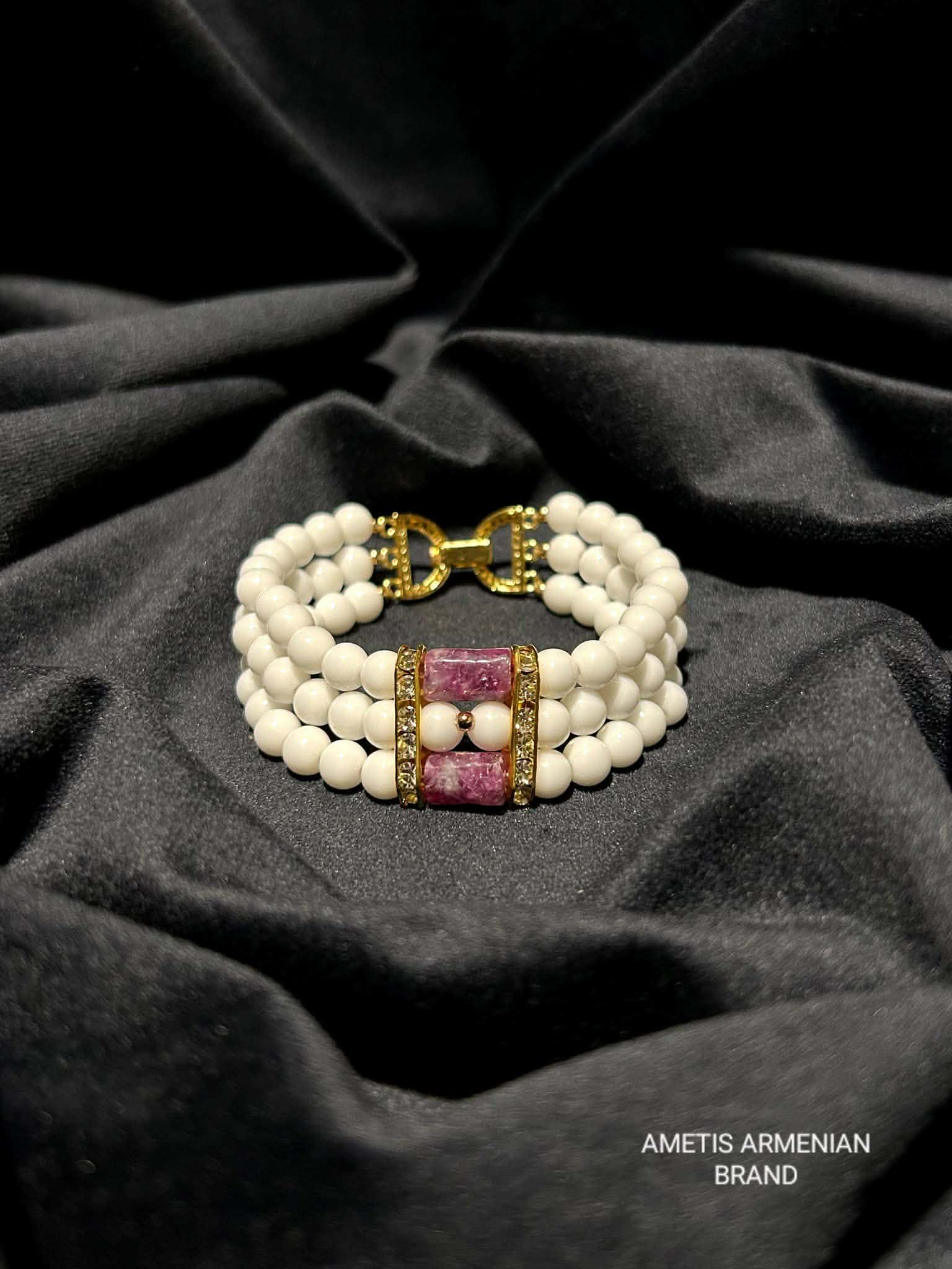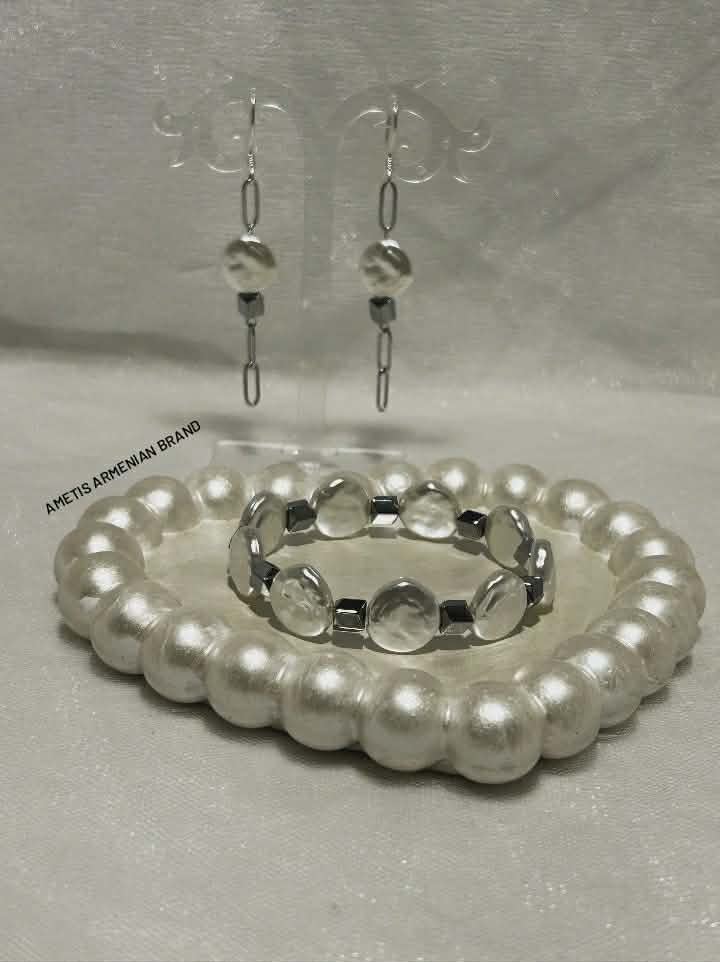 Bracelet made of natural stones. Imitation Pearl combined with silvery natural Hematite and silver...