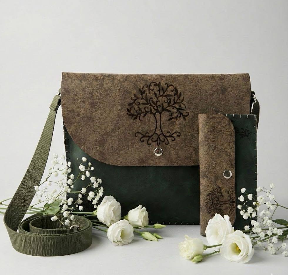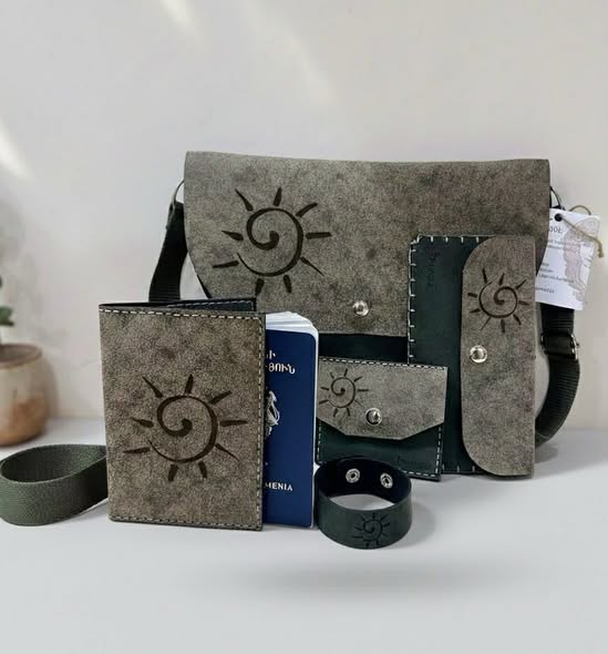 This handmade leather bag features a unique design inspired by prehistoric cave art and a sun-like c...